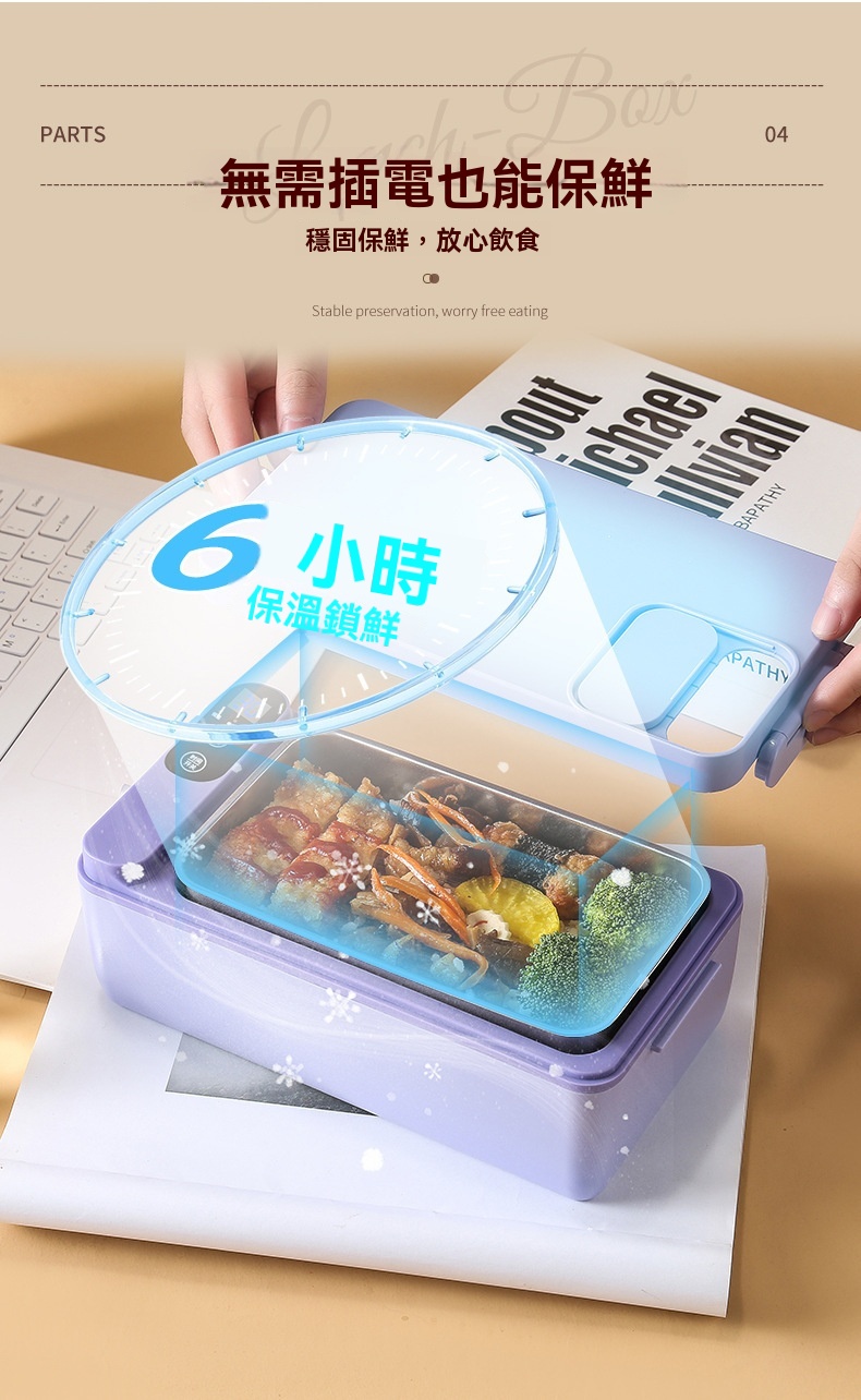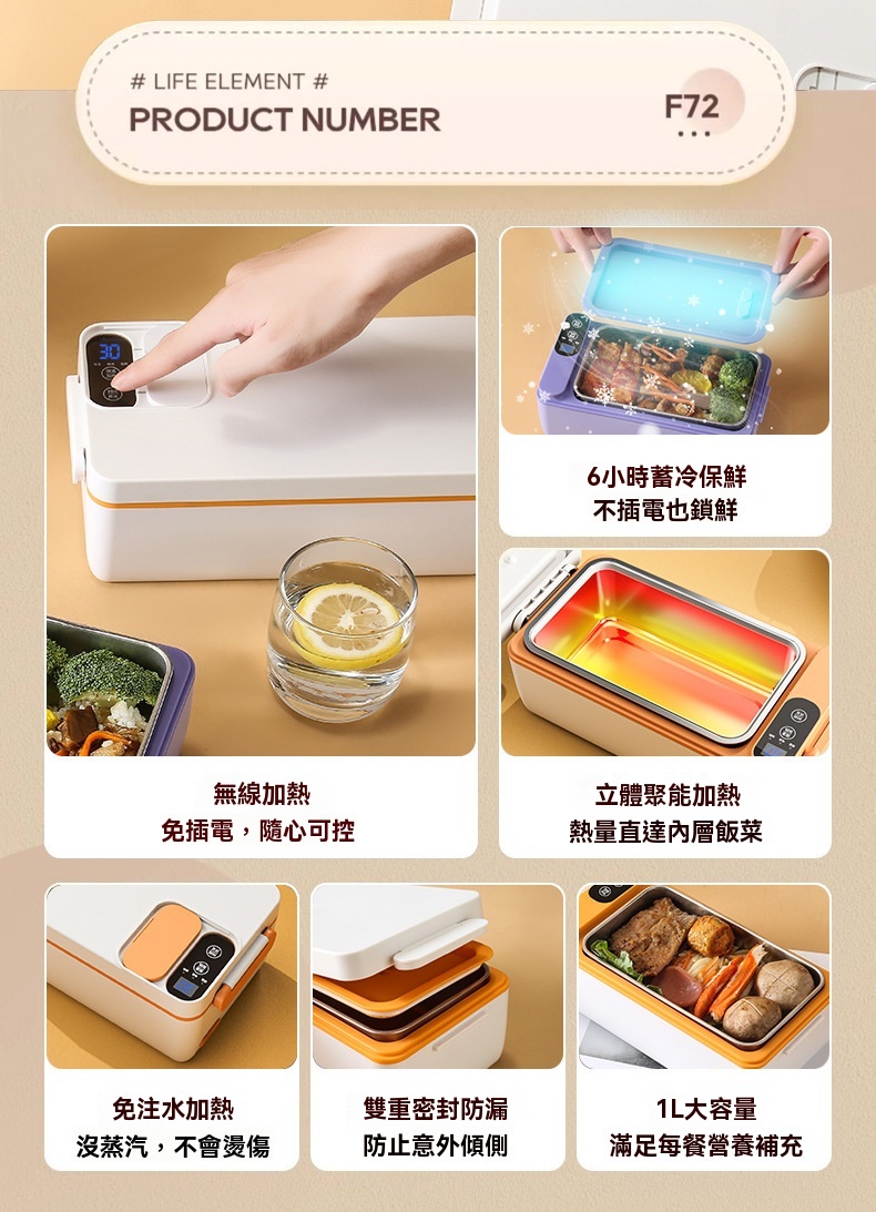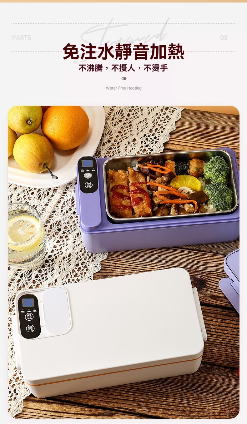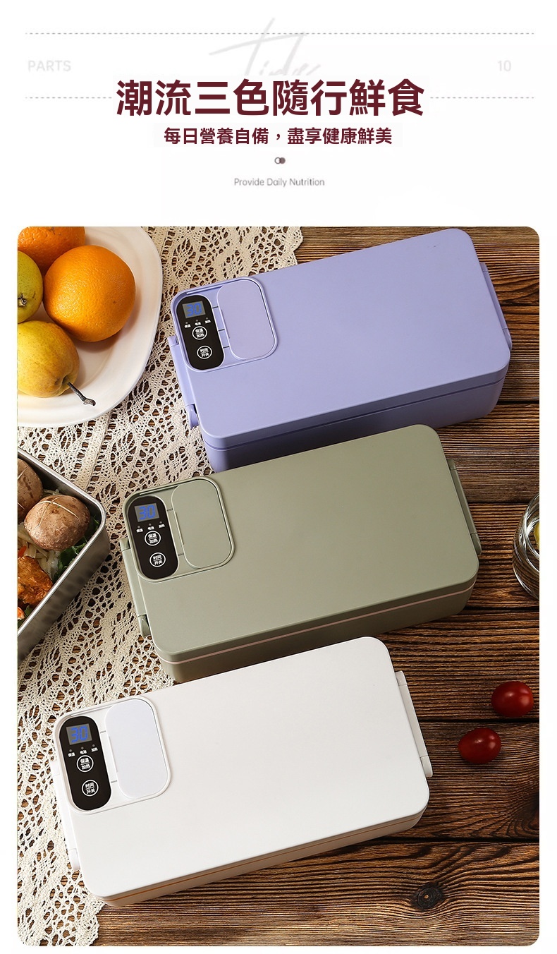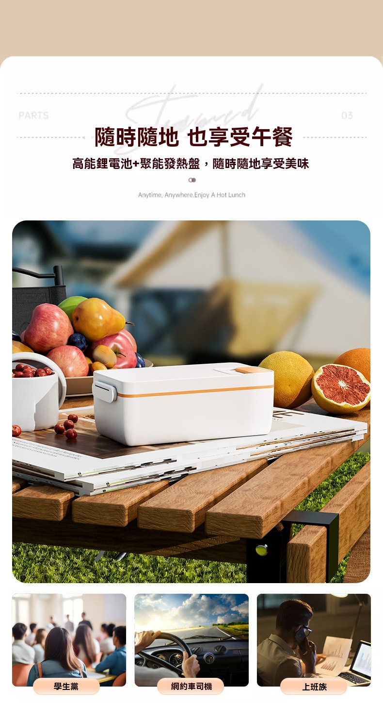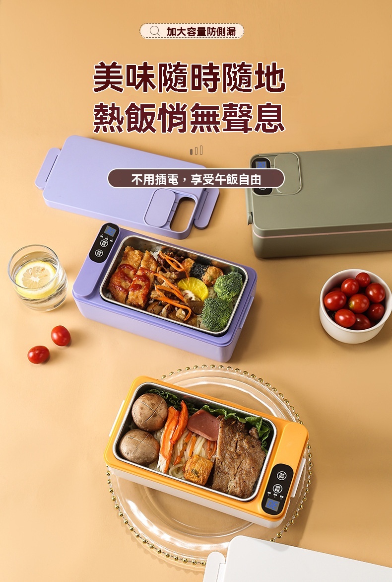 這款免插電智能電熱飯盒專為學生、上班族及戶外族群設計,解決無法插電加熱午餐的困擾。配備3200mAh高能電池與聚能發熱盤,無需加水即可立體加熱,一小時內讓飯菜均勻熟透,過程靜音且不燙手。產品具備6小時蓄冷保鮮能力,雙重密封防漏設計確保傾側不溢出。1L大容量搭配內建分隔板,方便葷素搭配。內膽採用304食品級不鏽鋼,易清洗且耐用。提供白/綠/紫三色選擇,外型精巧,附電源接口防水套與保護開關,使用更安心。
