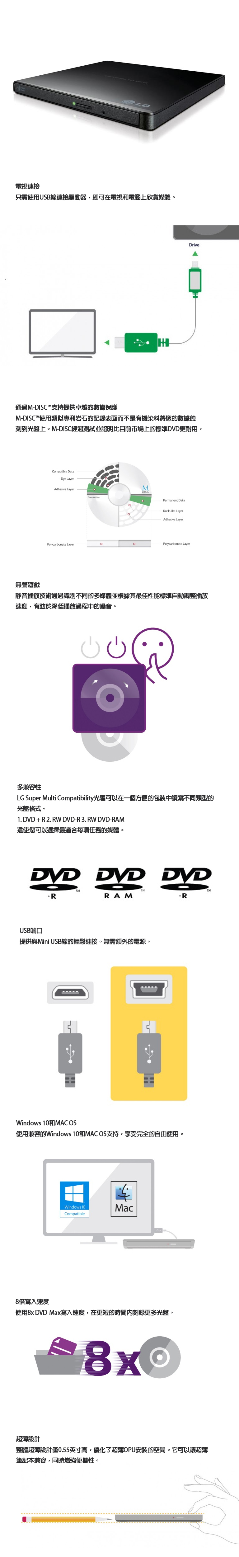 這款LG GP65NB60外置DVD光碟機,以簡約黑色的超薄設計,成為您行動辦公與家庭娛樂的得力助手。它不僅能輕鬆連接電視,直接播放多媒體內容,更支援M-DISC™千年光碟歸檔技術,為您的重要數據提供磐石般的永久保護。搭載靜音播放與流暢播放技術,並具備高速8倍寫入速度,是兼顧實用性與數據安全的首選。
