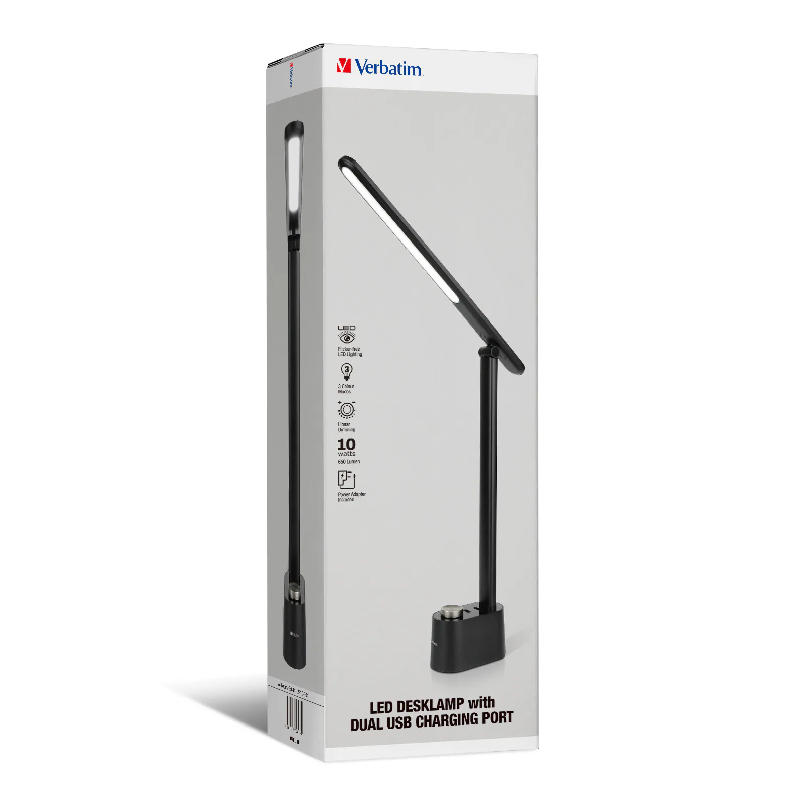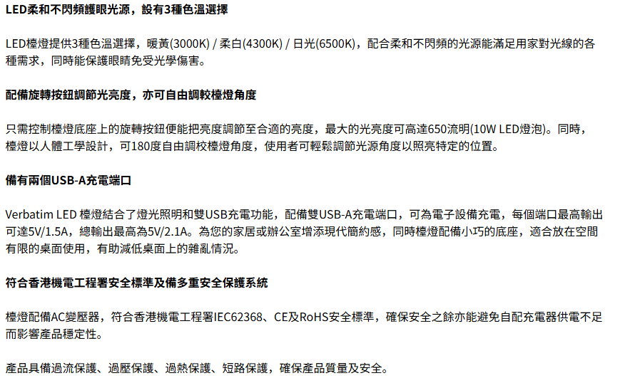 Verbatim 雙USB充電口連LED護眼檯燈,是一款集專業照明與便捷充電於一身的桌面神器。它採用LED柔和不閃頻護眼光源,並提供三種色溫選擇,最高亮度可達650流明,滿足您閱讀、工作或休閒的不同需求。產品設計以人體工學為本,燈臂可180度自由調節,配合底座上的旋轉按鈕,讓您輕鬆調整燈光角度與亮度。其最大亮點是底座配備了兩個USB-A充電端口,總輸出最高達5V/2.1A,可同時為手機或平板等設備充電,讓桌面告別繁雜線纜。此產品已通過香港機電工程署IEC62368等安全標準,並具備過流、過壓、過熱及短路保護,使用安全可靠。簡約小巧的底座設計,更是節省空間的理想之選。