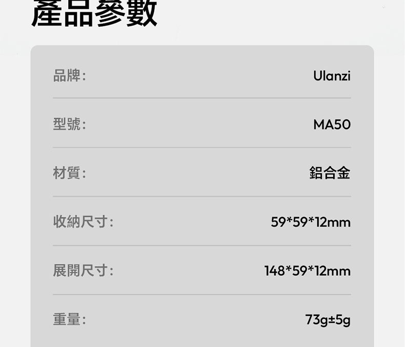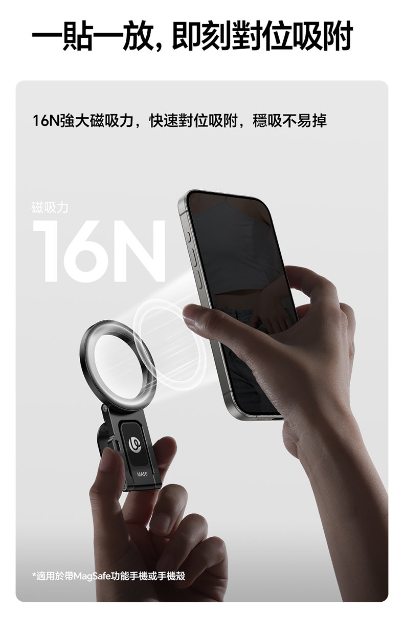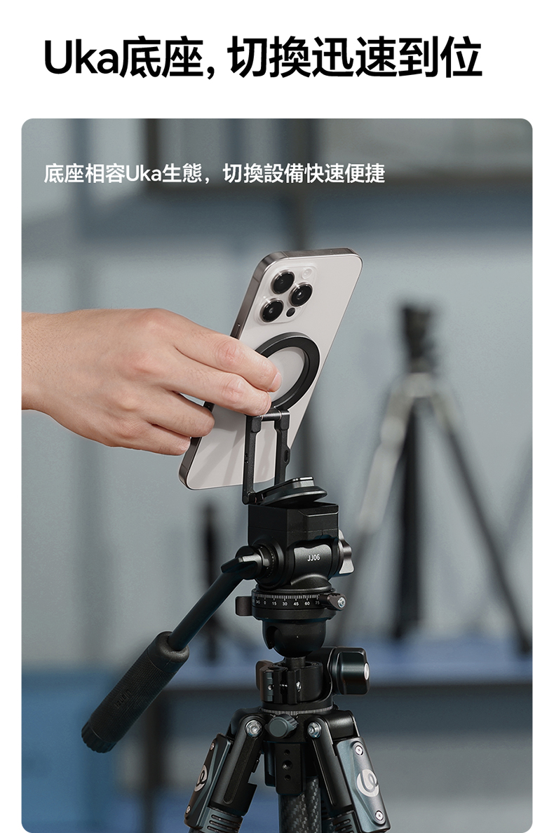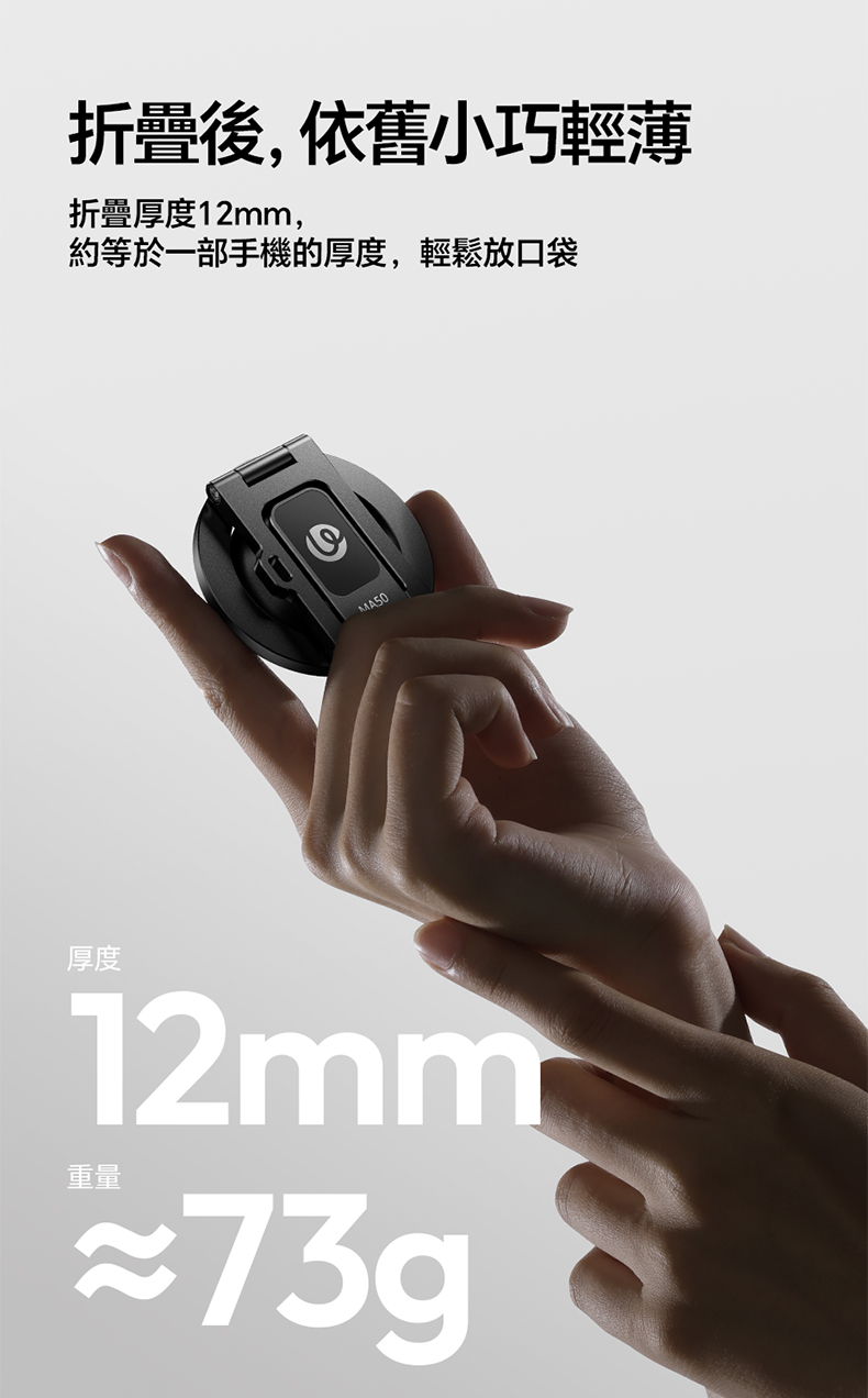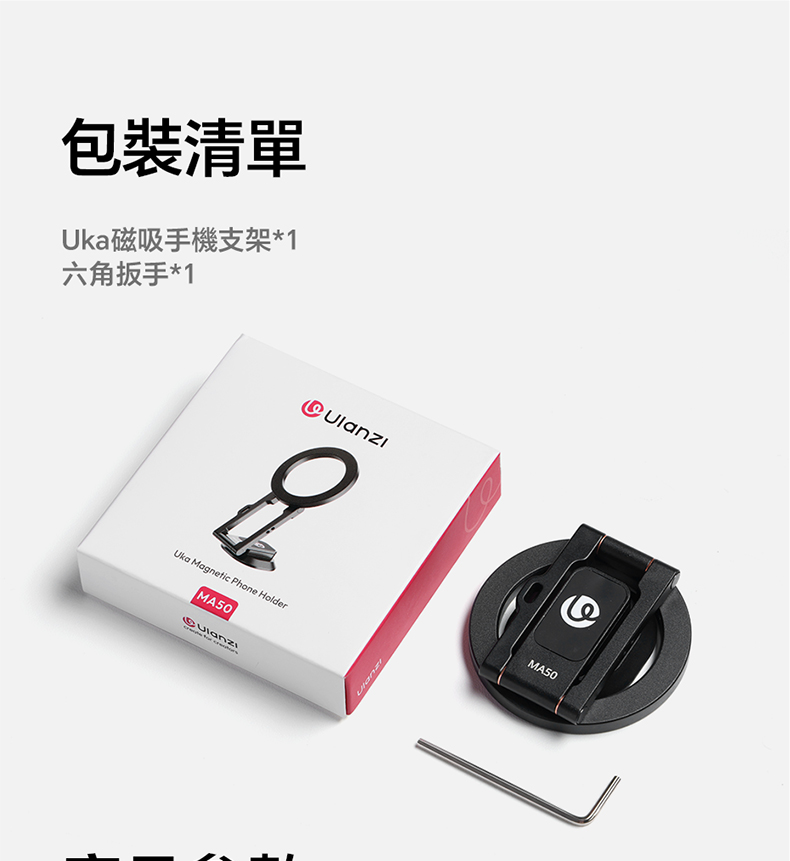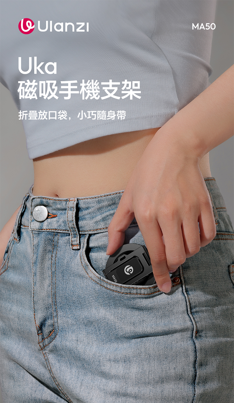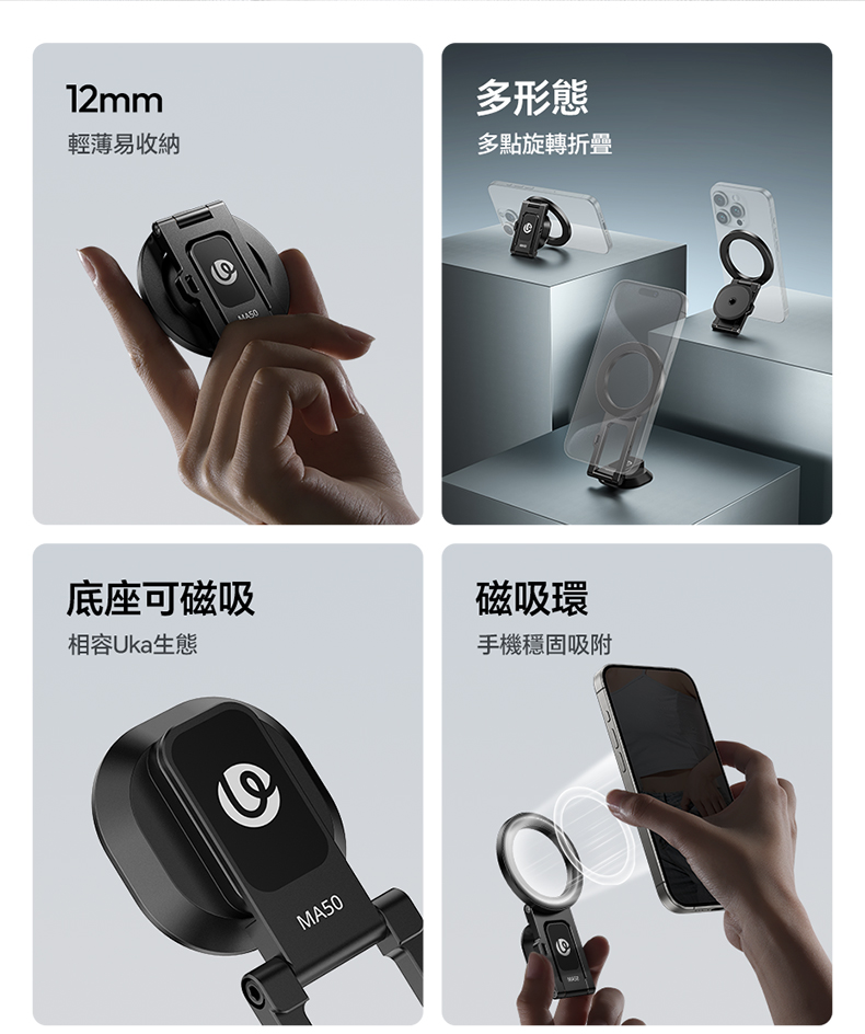 ULANZI MA50 UKA 磁吸手機支架,顛覆你對支架的想象。採用高硬度鋁合金材質打造,收納時僅有12mm薄,約等於一部手機的厚度,重量僅~73g,折叠後可輕鬆放入口袋,便攜無負擔。配備16N強勁磁吸力,能快速對位吸附,穩固不易掉落,適用於帶Magafe功能的手機或手機殼。獨特的兩段式轉軸設計,支援多角度旋轉調節;Uka底座能快速切換設備,相容Uka生態系列產品。除了手持,底座還可磁吸在鐵制平面或磁性表面上(底部磁吸承重約1.5kg),解鎖牆面等特殊拍攝機位,滿足多樣化創作需求。