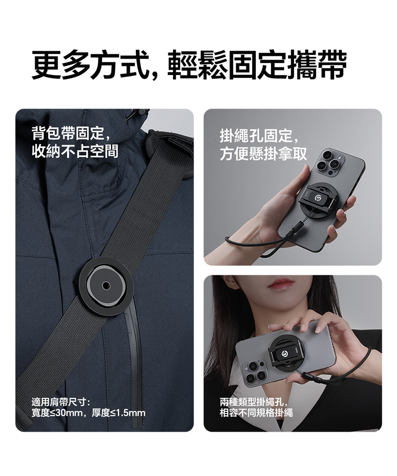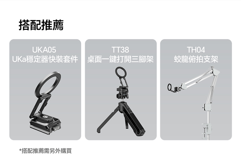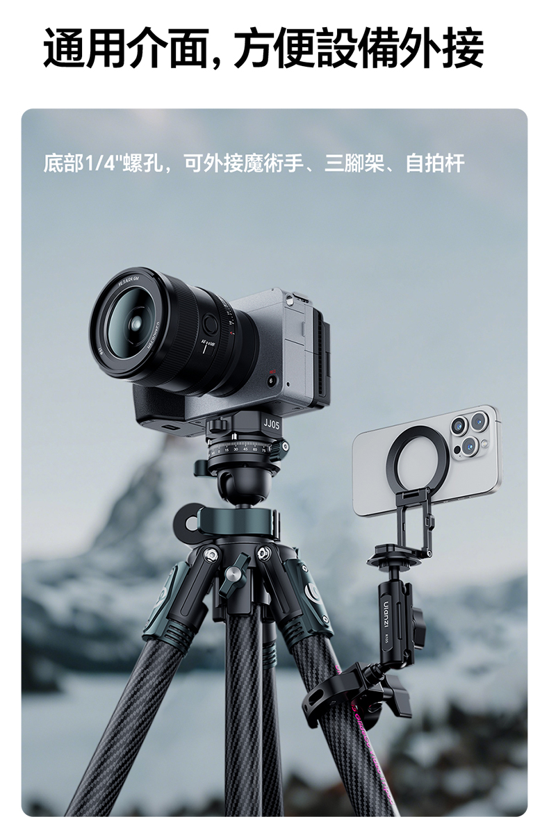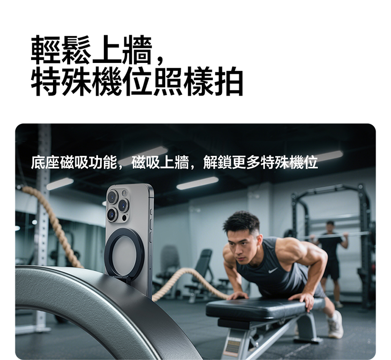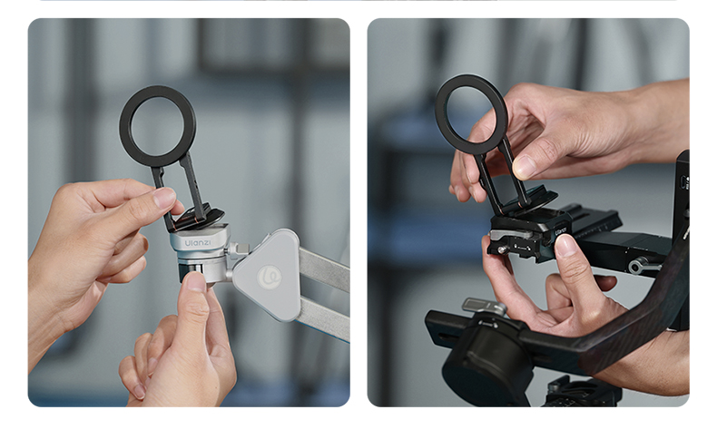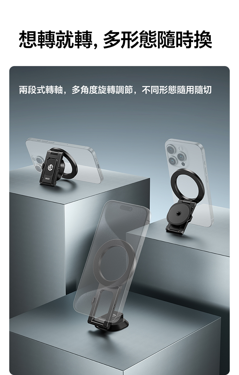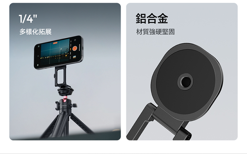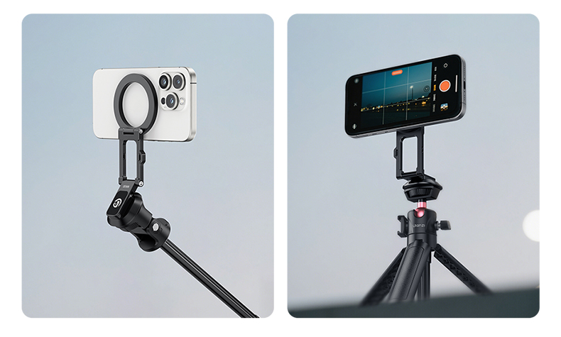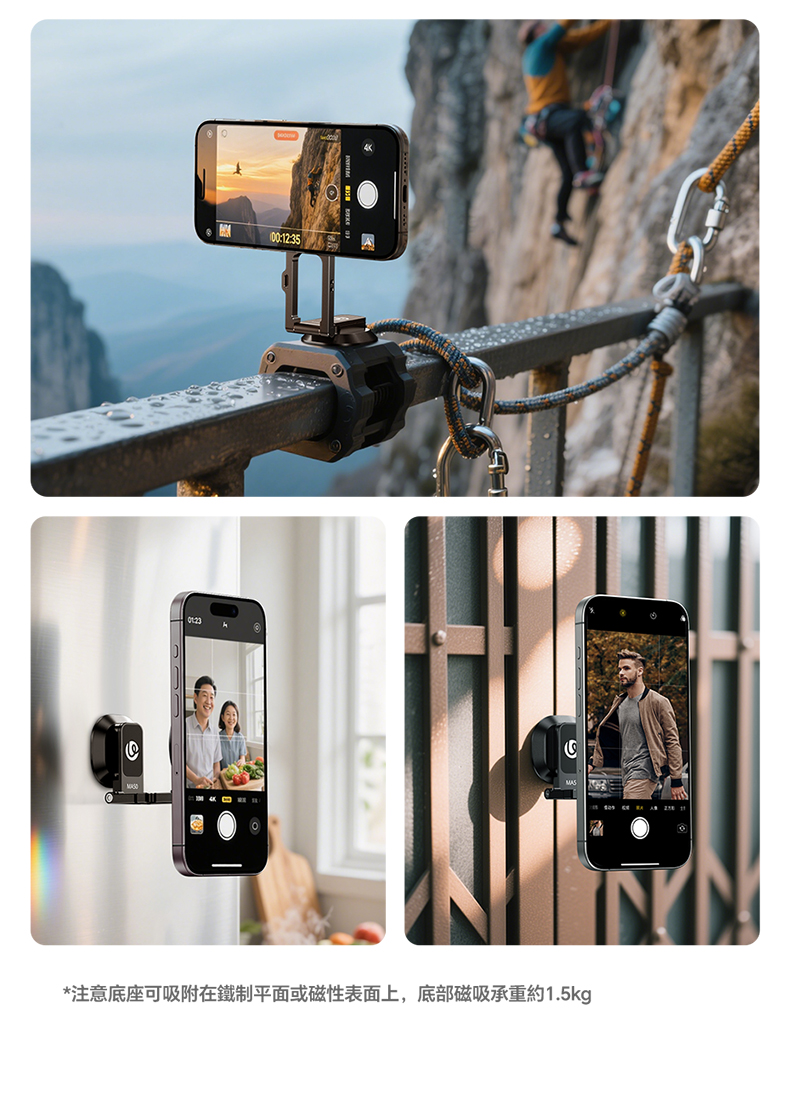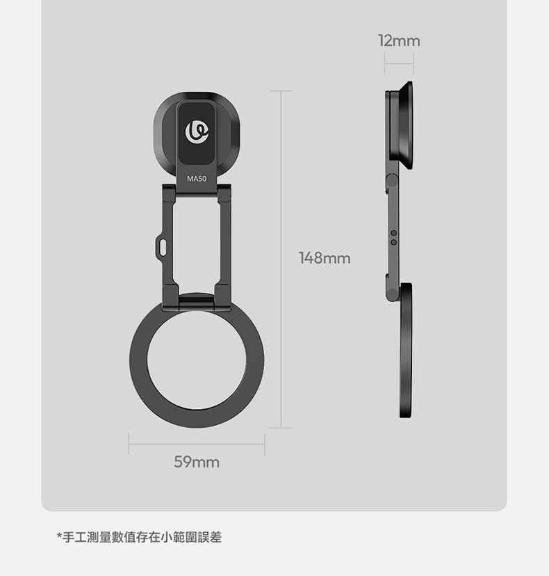 ULANZI MA50 UKA 磁吸手機支架,顛覆你對支架的想象。採用高硬度鋁合金材質打造,收納時僅有12mm薄,約等於一部手機的厚度,重量僅~73g,折叠後可輕鬆放入口袋,便攜無負擔。配備16N強勁磁吸力,能快速對位吸附,穩固不易掉落,適用於帶Magafe功能的手機或手機殼。獨特的兩段式轉軸設計,支援多角度旋轉調節;Uka底座能快速切換設備,相容Uka生態系列產品。除了手持,底座還可磁吸在鐵制平面或磁性表面上(底部磁吸承重約1.5kg),解鎖牆面等特殊拍攝機位,滿足多樣化創作需求。