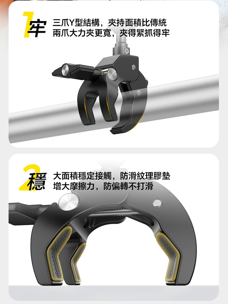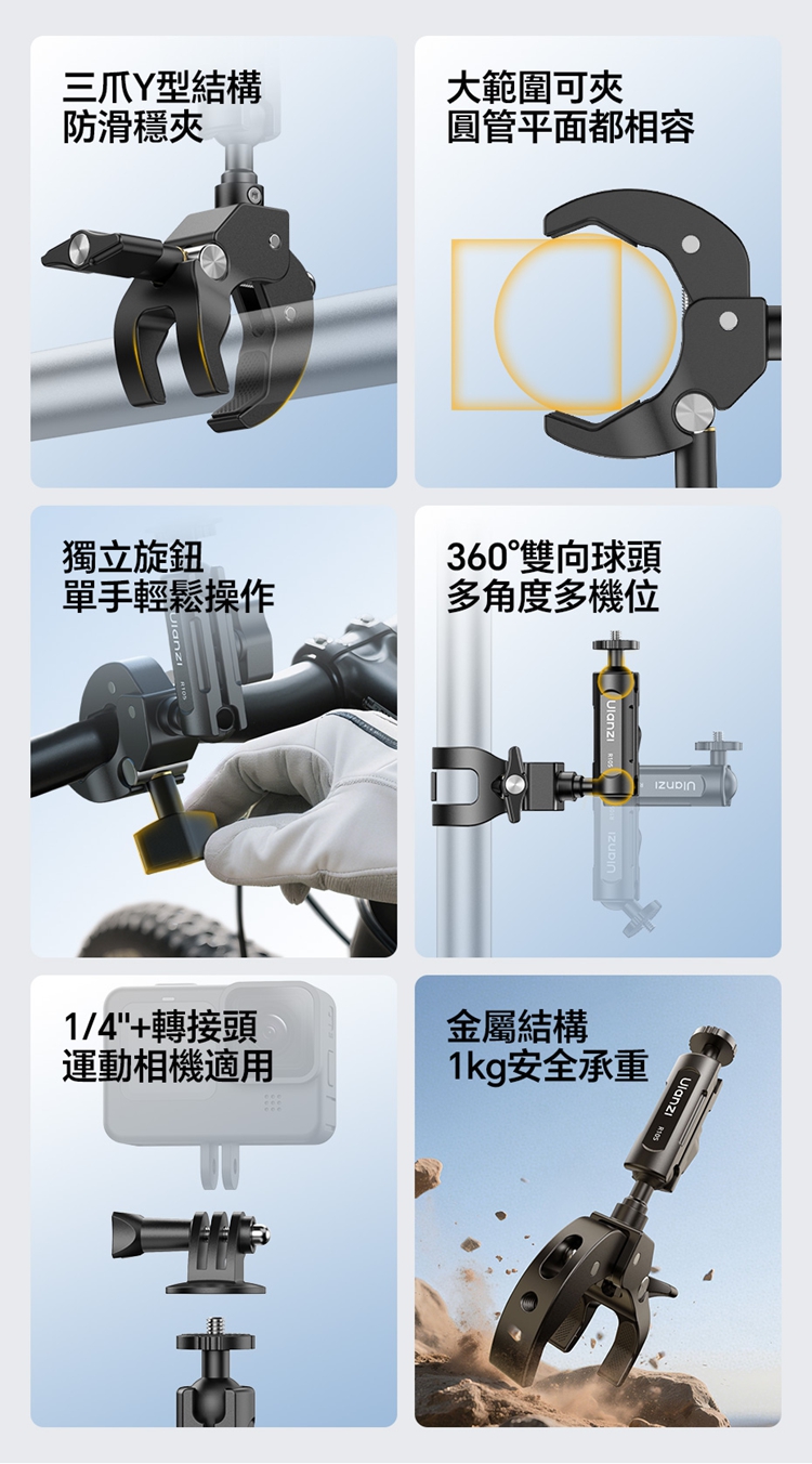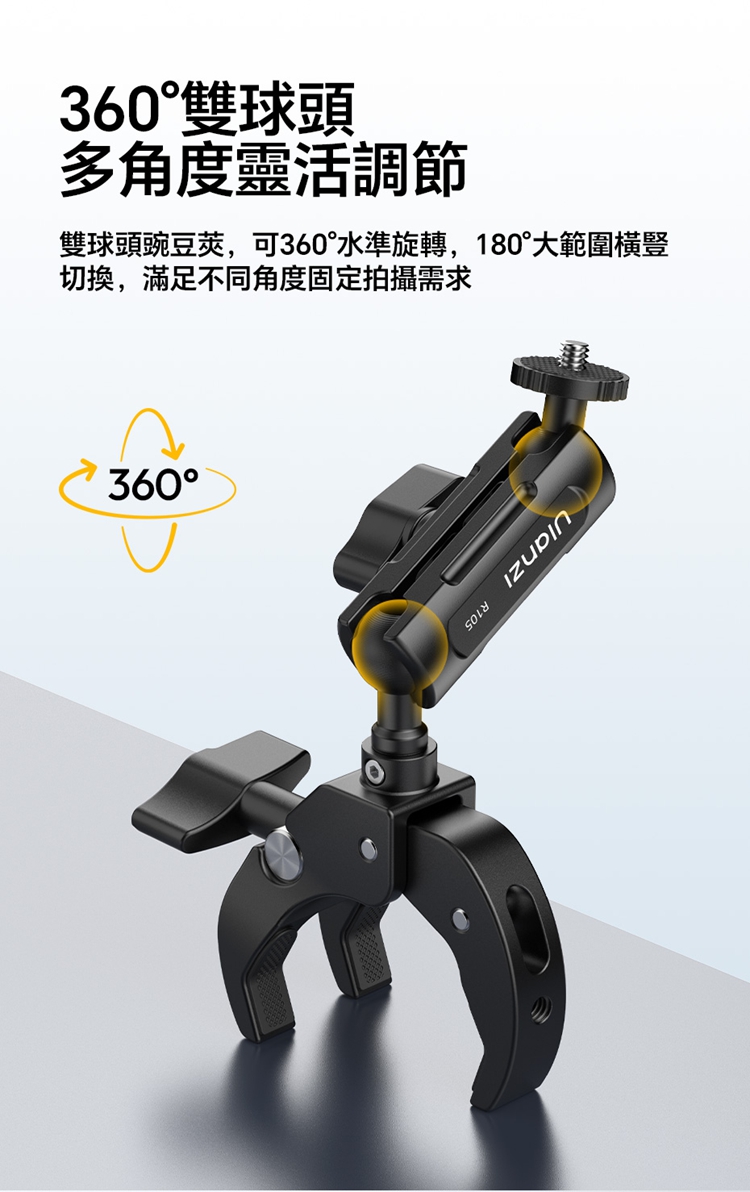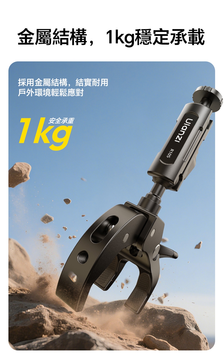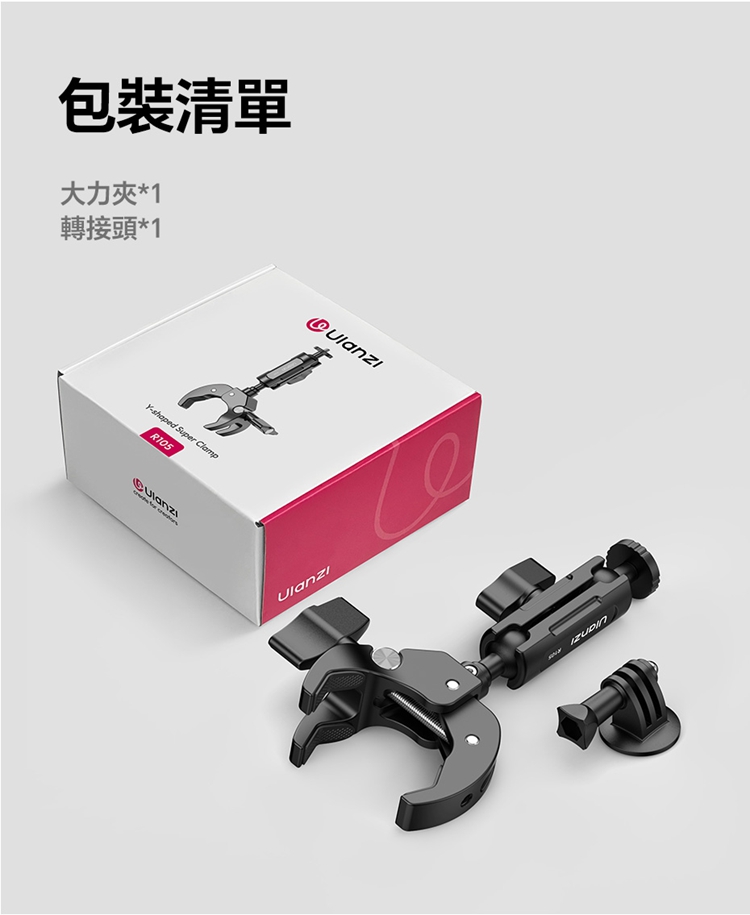Ulanzi R105 Y型大力夾採用創新的三爪Y型結構,夾持面比傳統兩爪更寬,能穩固夾持圓管及平面物體,且配備防滑紋理膠墊,增大摩擦力,確保拍攝時不偏轉、不打滑。其獨立旋鈕支援12-55mm大範圍夾持,旋鈕扁平且面積大,即使佩戴手套也能輕鬆調節。產品內建360°雙向球頭,可實現多角度靈活調節,滿足豎拍橫拍等不同角度需求。配備標準1/4"螺絲介面與運動相機轉接頭,可外接卡片相機、全景相機、監視器或小型補光燈等設備。主體採用金屬結構,結實耐用,具備1kg安全承重,能輕鬆應對戶外拍攝環境。包裝內含大力夾主體及轉接頭。