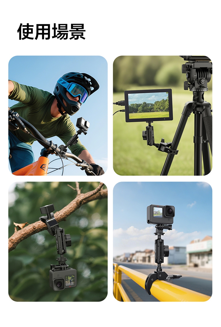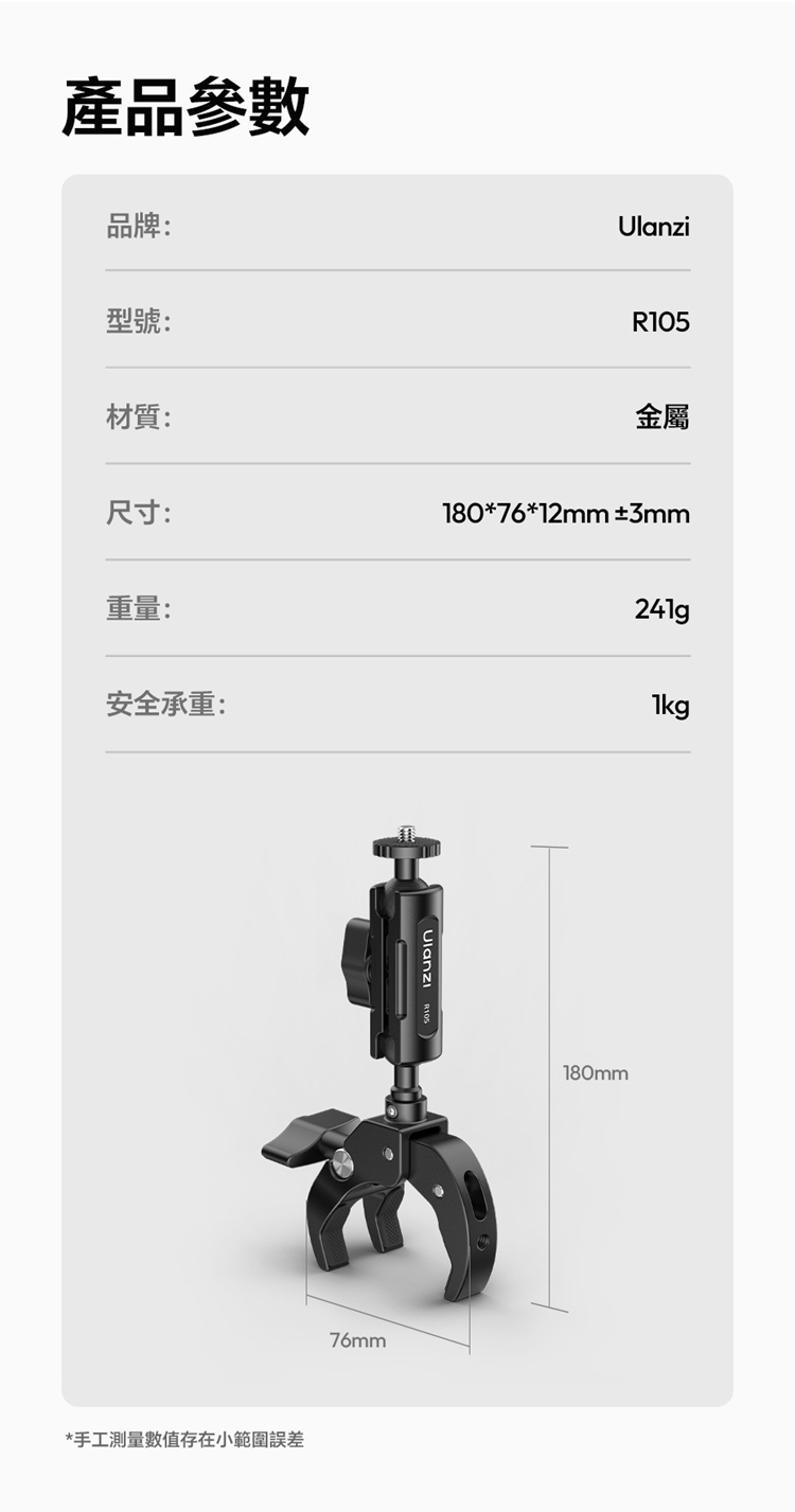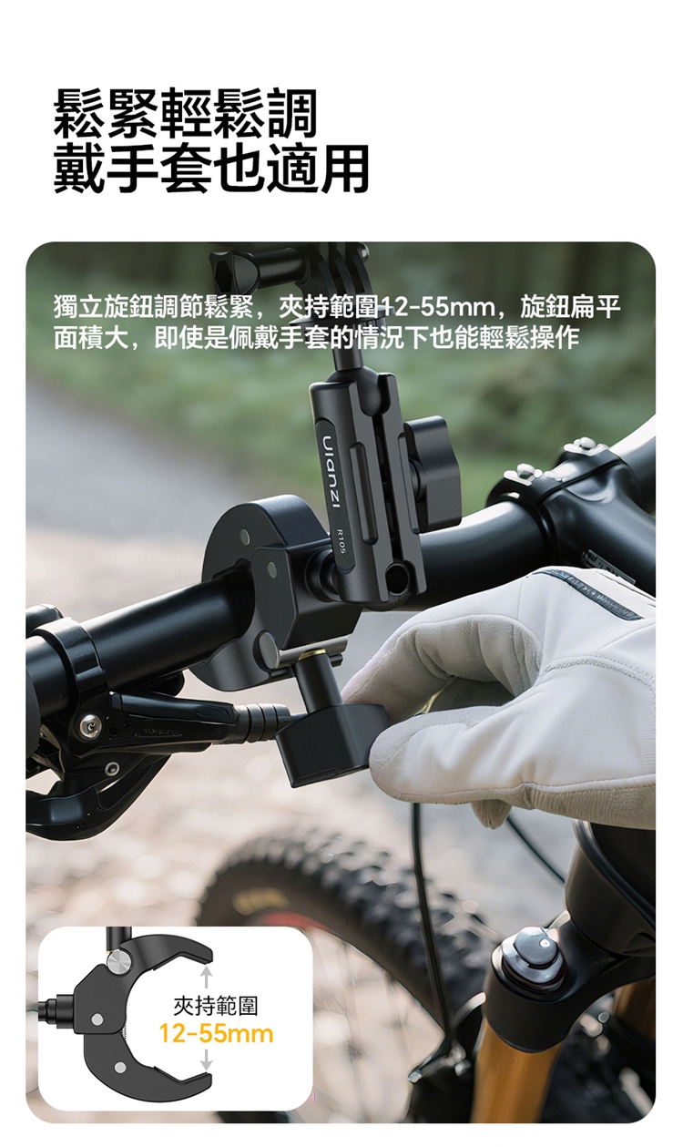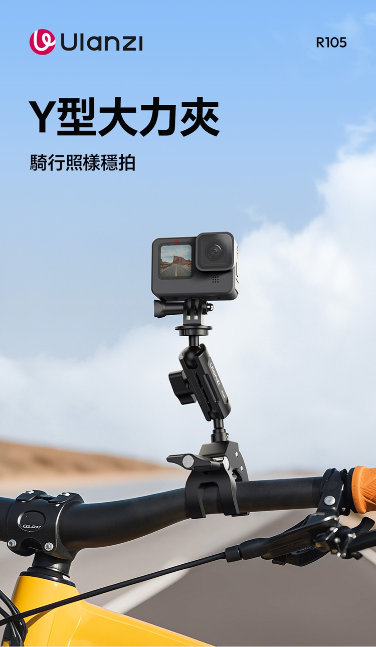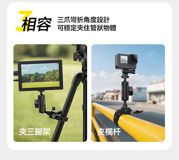 Ulanzi R105 Y型大力夾採用創新的三爪Y型結構,夾持面比傳統兩爪更寬,能穩固夾持圓管及平面物體,且配備防滑紋理膠墊,增大摩擦力,確保拍攝時不偏轉、不打滑。其獨立旋鈕支援12-55mm大範圍夾持,旋鈕扁平且面積大,即使佩戴手套也能輕鬆調節。產品內建360°雙向球頭,可實現多角度靈活調節,滿足豎拍橫拍等不同角度需求。配備標準1/4"螺絲介面與運動相機轉接頭,可外接卡片相機、全景相機、監視器或小型補光燈等設備。主體採用金屬結構,結實耐用,具備1kg安全承重,能輕鬆應對戶外拍攝環境。包裝內含大力夾主體及轉接頭。