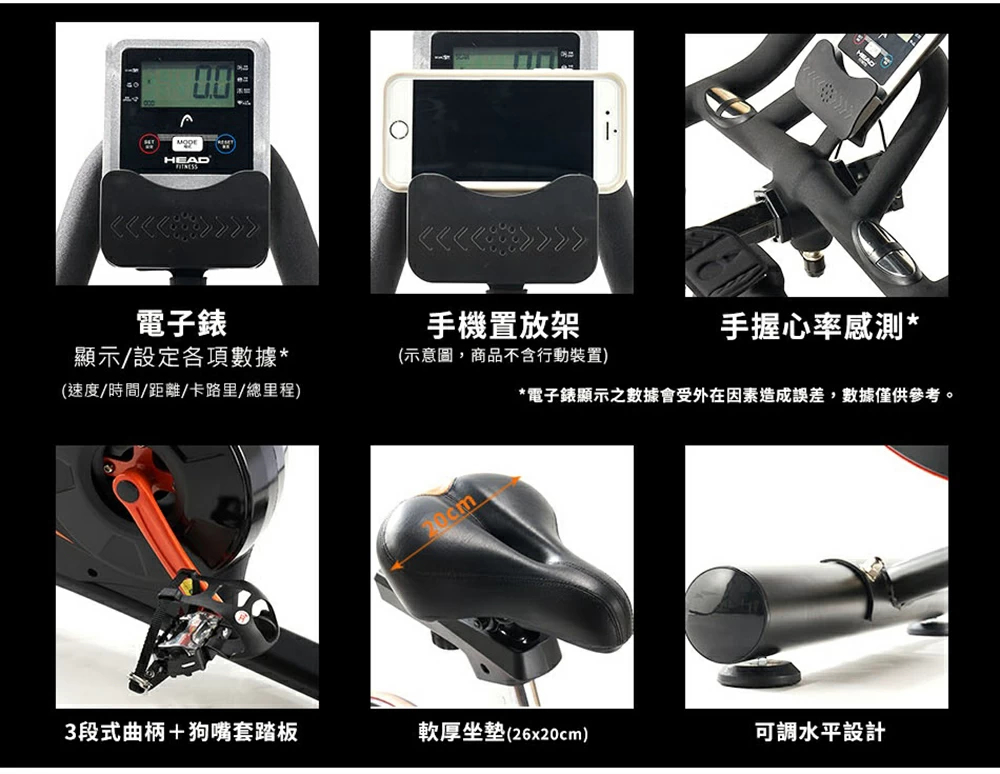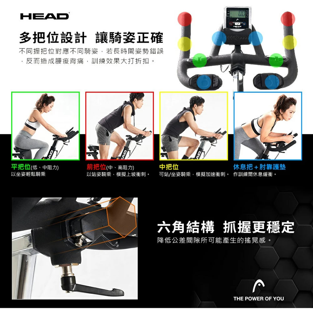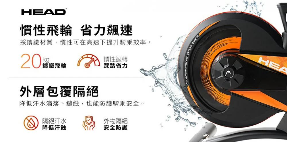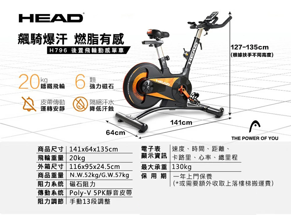 Head H796 後置飛輪動感單車採用創新後置飛輪設計,有效減少汗水鏽蝕問題。配備20kg鑄鐵飛輪與專業0磨耗磁控系統,6顆強力磁石提供13檔阻力調節,滿足不同訓練強度。引擎同級Poly-V車用皮帶搭配專用軸承,踩踏順暢安靜且耐用。多把位設計配合四向調整座椅,可因應不同身形及騎姿加強訓練效能。電子錶顯示速度、時間、卡路里及總里程,並具備手握心率偵測功能。獨家六角穩固結構確保騎乘穩定,底部移動底輪方便搬移。