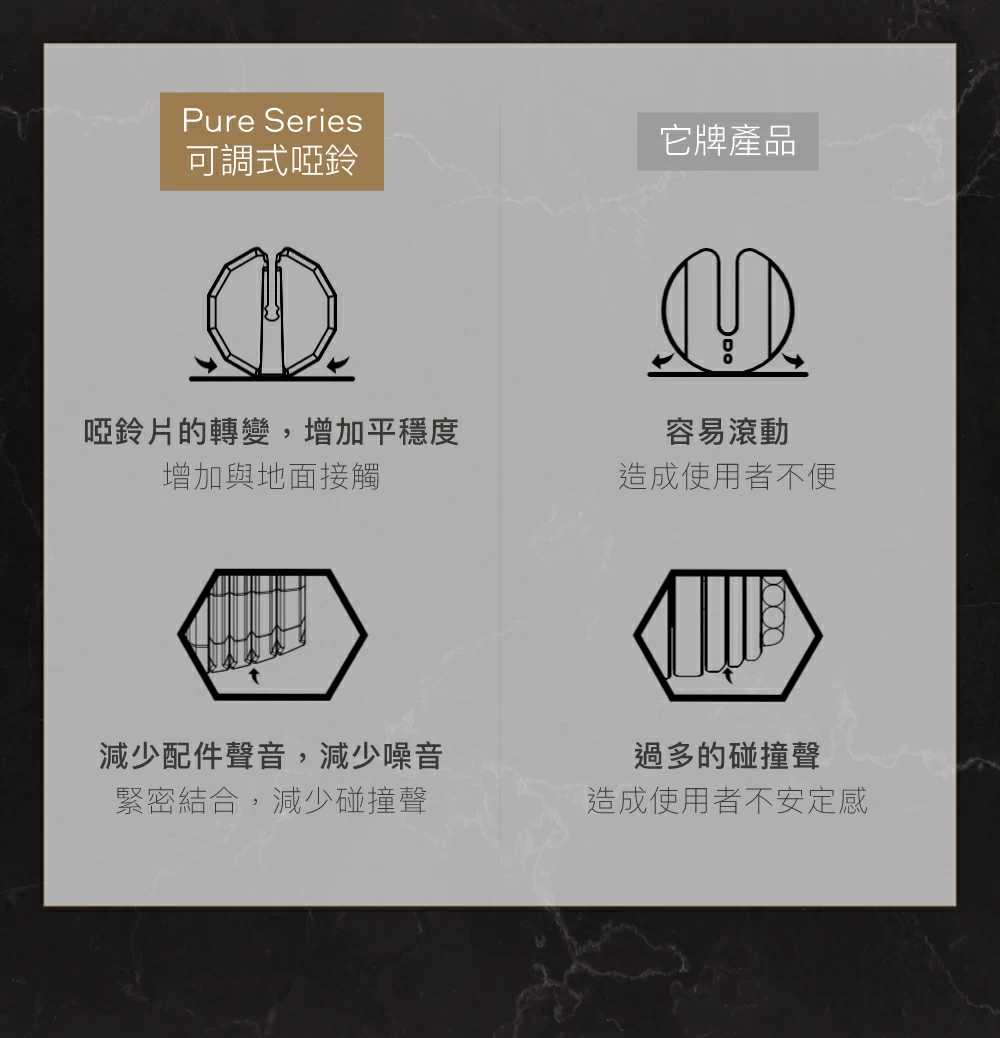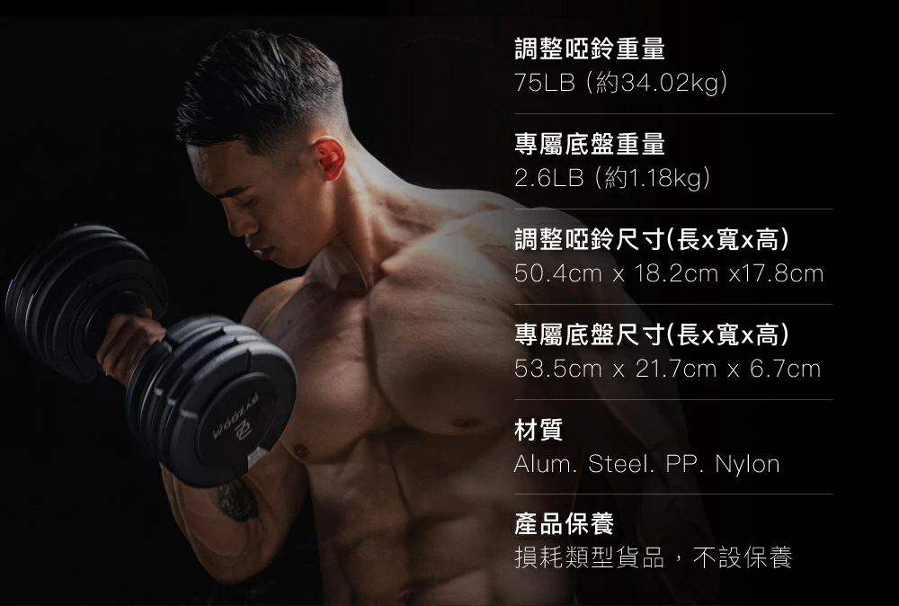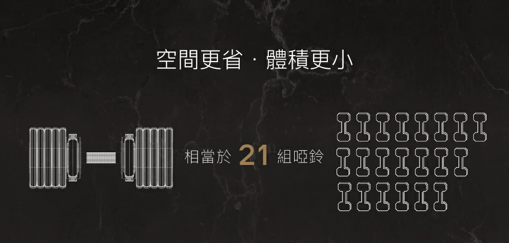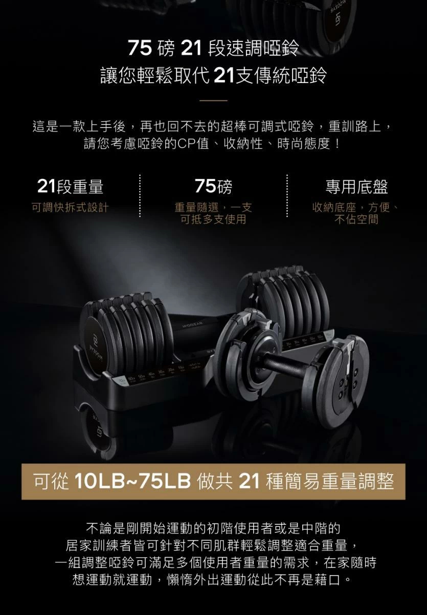這款 ByZoom Pure Series 75LB 可調式啞鈴,集 21 段重量 (4.5-35KG) 於一身,可秒速變換,滿足不同訓練強度。其設計追求極致美學,採用時尚黑色配以 超防滑金屬咬花手柄,手感舒適且防止滑手。附帶的 專用收納底座 堅韌耐重,收納不佔空間。此外,設計著重減少轉換噪音與增加平穩度,讓訓練更專注。啞鈴會隨重量增加而 增長長度,不受固定長度限制,便利性極高。