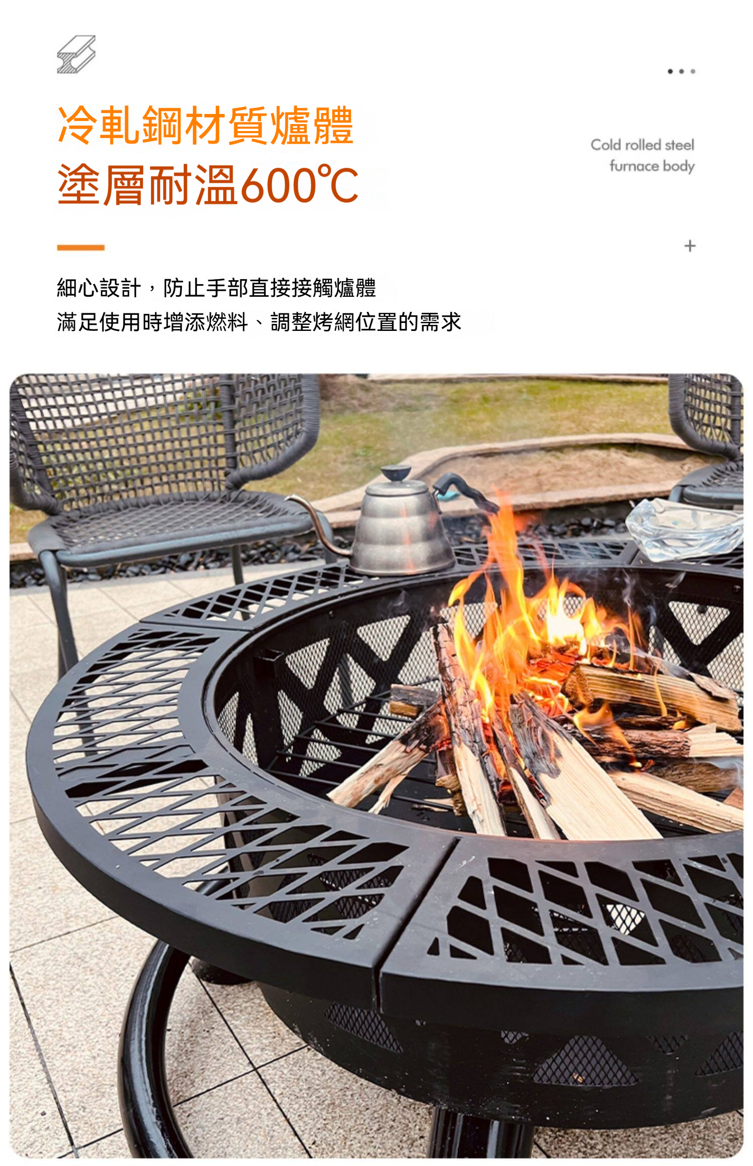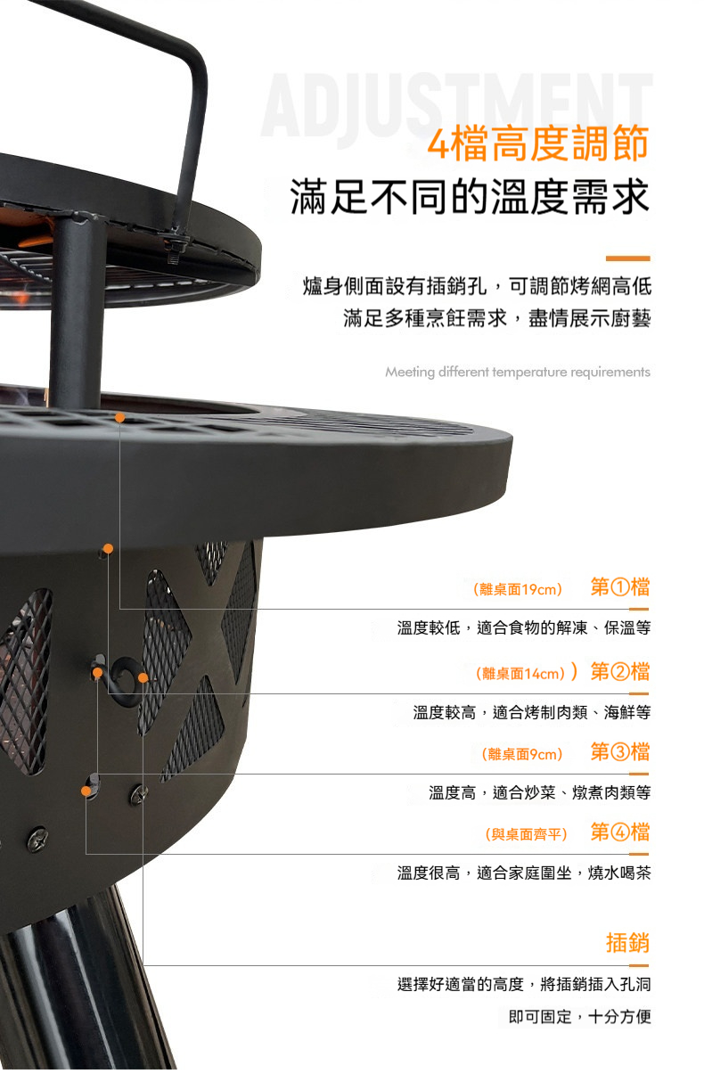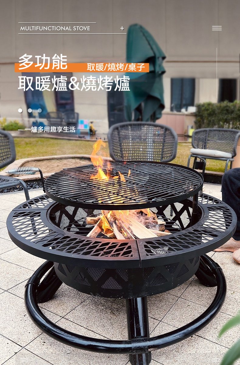 這款多功能取暖爐與燒烤爐集取暖、燒烤、桌子功能於一體,一爐多用,輕鬆切換不同形態。採用冷軋鋼爐體與搪瓷烤網,堅固耐用且易於清潔。360°環式供暖,四周均能供熱,告別傳統單面取暖。爐身設有四檔高度調節,滿足多種烹飪需求,無論戶外露營或居家圍爐,都能愜意享受。
