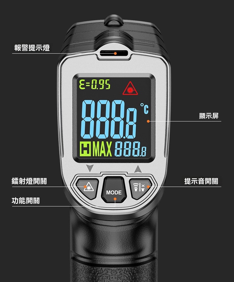 這款光電感測紅外測溫槍採用非接觸式設計,透過紅外線能量快速測量物體表面溫度,只需0.5秒即可完成測溫。其配備13點環形鐳射定位功能,按住開關即可精確鎖定測量區域,並支援-50°C至500°C的寬廣溫度測量範圍,滿足多樣化場景需求。產品具備高低溫聲光報警功能,當溫度超過設定值時會自動提示。發射率可調(0.1~1.0),能針對不同材質進行調整以減少測量誤差。機身採用ABS環保外殼,堅固耐用,並支援°C/°F單位切換,操作便捷。適用於食品烘焙、油溫測量、電路檢測、混凝土溫度監測等多種工業及日常用途。