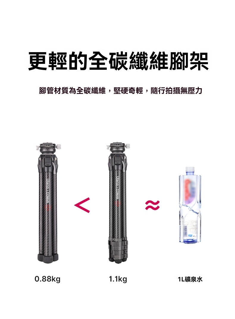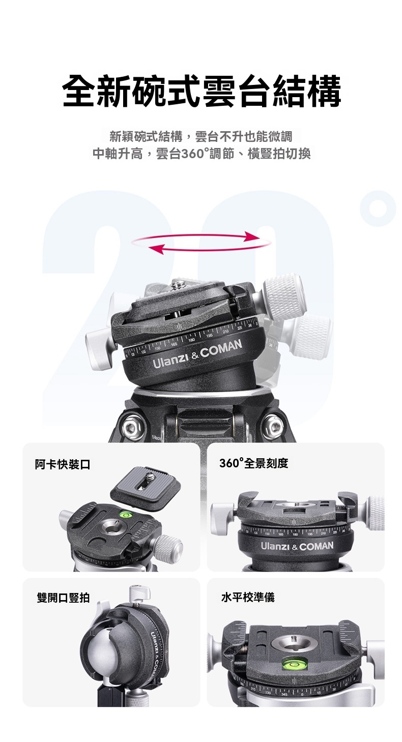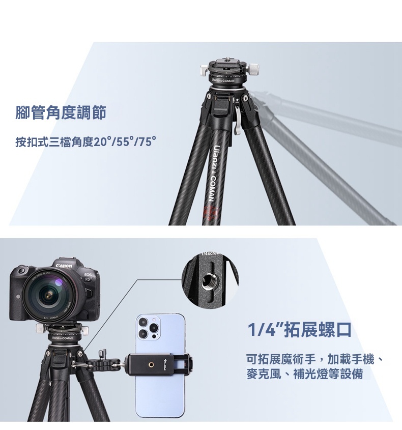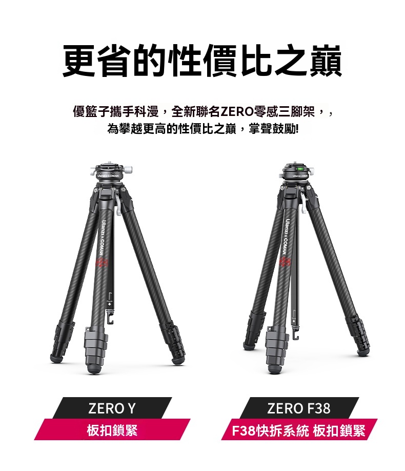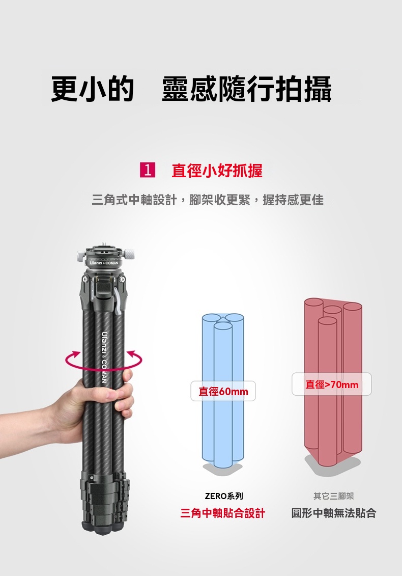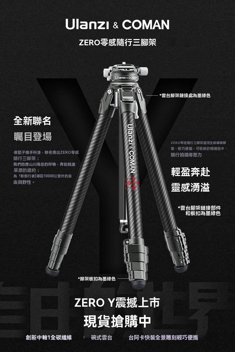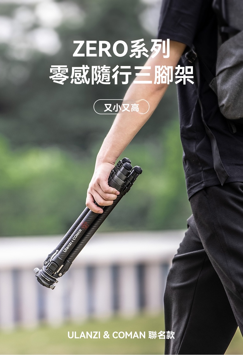 Ulanzi & COMAN 聯名推出的ZERO零感隨行三腳架,是專為追求極致便攜與穩定性的攝影愛好者設計的產品。該系列採用全碳纖維材質,輕巧堅固,適合長時間戶外使用。腳管可調節至20°、55°、75°三種角度,滿足不同拍攝需求。全新碗式雲台結構提供360°全景刻度,並配備雙開口豎拍設計和水平校準儀,確保精準對焦與穩定性。 ZERO系列擁有18KG承重能力,即使在大風環境下也能穩如泰山。中軸採用創新兩節可拆結構,方便低角度拍攝,同時支持倒置模式,適合微距或平面擺拍創作。腳架重量僅約1KG,收納後長度僅40CM,輕鬆裝入相機包,隨時隨地捕捉靈感。 此外,ZERO系列還配備多功能扳手,可快速調整腳管緊繃度,並具備拓展螺口,兼容手機、麥克風等設備,進一步擴展應用場景。無論是遠足登山還是城市街拍,ZERO零感隨行三腳架都能為您帶來無限創意與自由體驗。